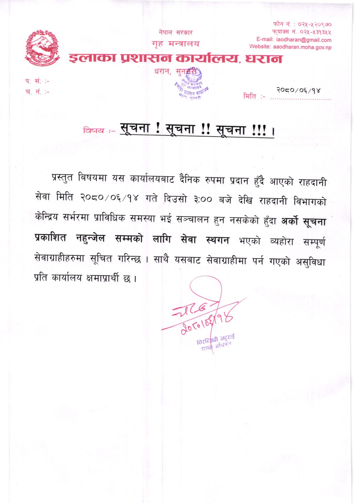 राहदानी सम्बन्धी सेवा अवरुद्ध भएकाे बारे ।
