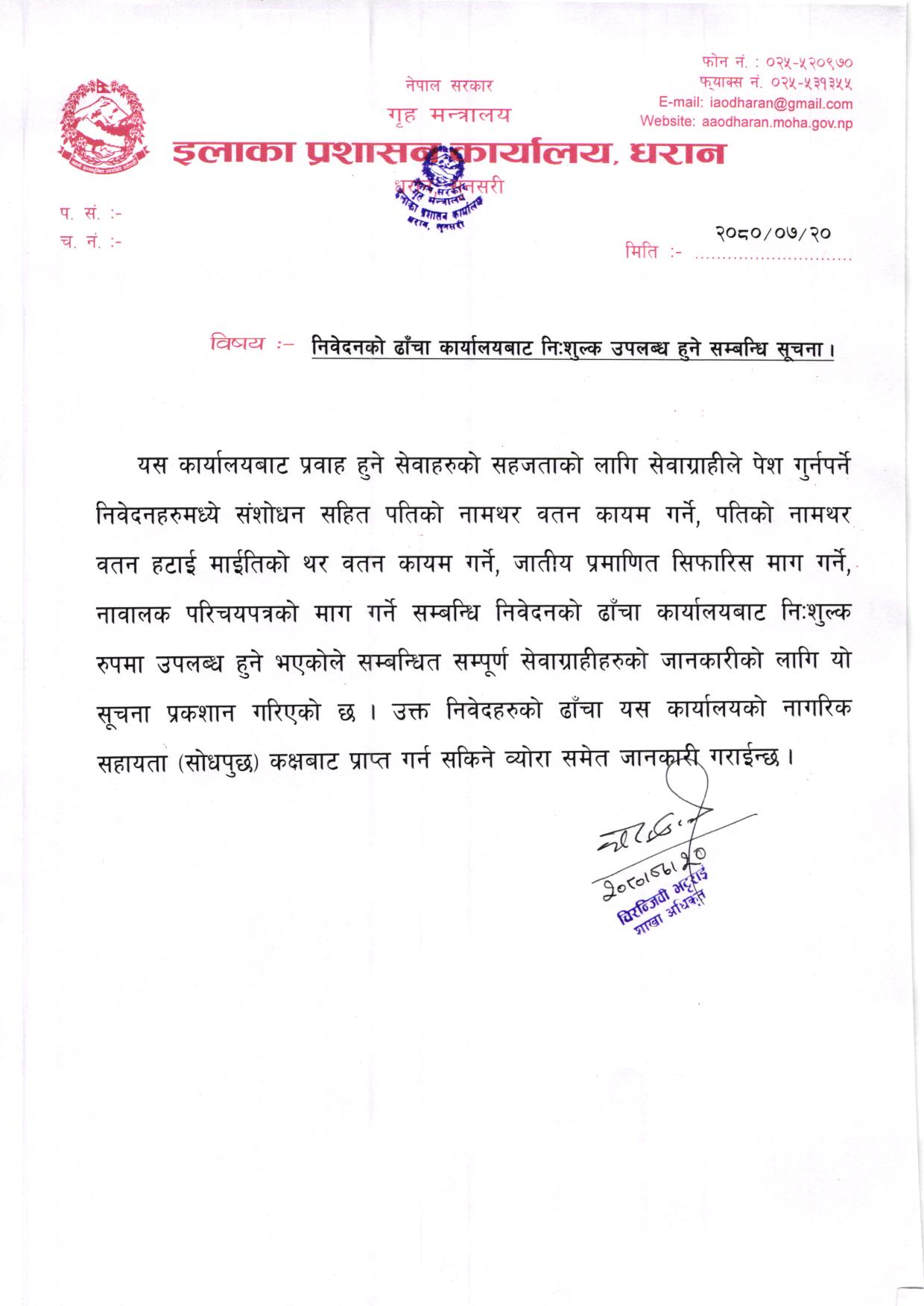 निवेदनकाे ढाँचा कार्यालयबाट निशुल्क उपलब्ध हुने सम्बन्धी सूचना ।